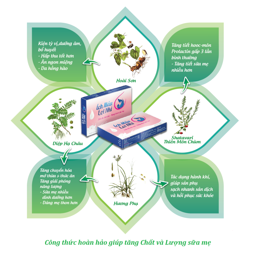 Shatavari hiện nay đã được kết hợp với các dược liệu khác như Hoài Sơn, Diệp Hạ Châu, Hương Phụ là những dược liệu quý, có tác dụng tốt với phụ nữ sau sinh trong sản phẩm Ích Mẫu Lợi Nhi. Hoài Sơn có tác dụng kiện tỳ vị, bổ huyết, giúp tăng hấp thu, ăn ngon miệng. Trong khi đó, Diệp Hạ Châu, Hương Phụ là hai dược liệu tác động mạnh mẽ vào tạng gan, giúp tăng cường chức năng chuyển hóa, khi cơ thể mẹ hấp thu và chuyển hóa tốt các chất dinh dưỡng sẽ giúp sữa giàu dinh dưỡng hơn.