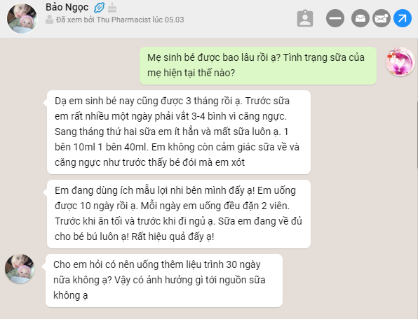 Mẹ Phạm Hồng Mai, Thanh Trì Hà Nội: “Hay lắm, em bị ít sữa 4 tháng đầu cu con phải dùng sữa công thức, táo bón suốt ấy, thế mà dùng cái có thảo dược Shatavari ấy, đêm thứ 2 sữa đã về rần rần, ướt cả áo…”